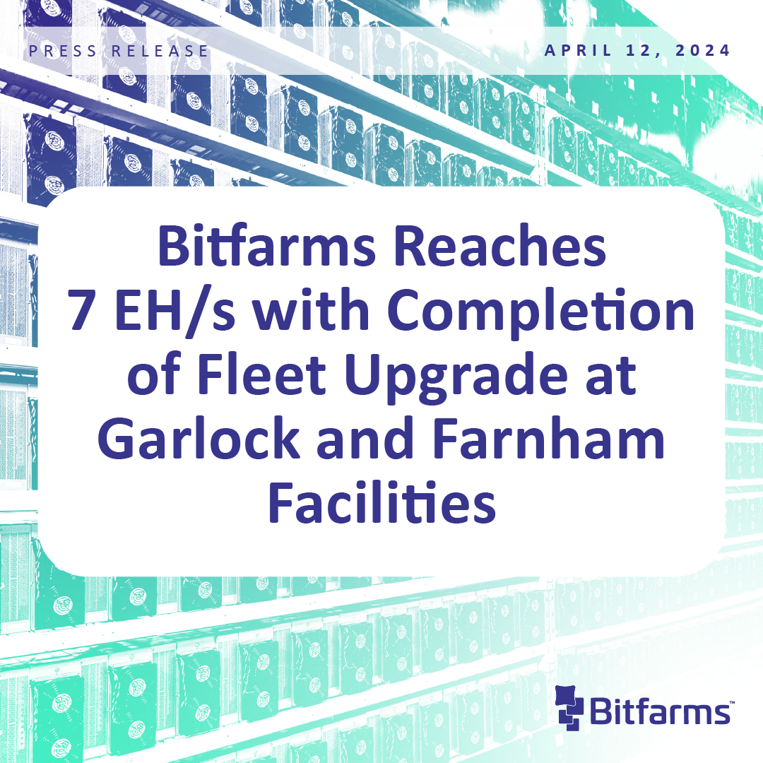 Bitfarms Reaches 7 EH/s with Completion of Fleet Upgrade at Garlock and Farnham Facilities