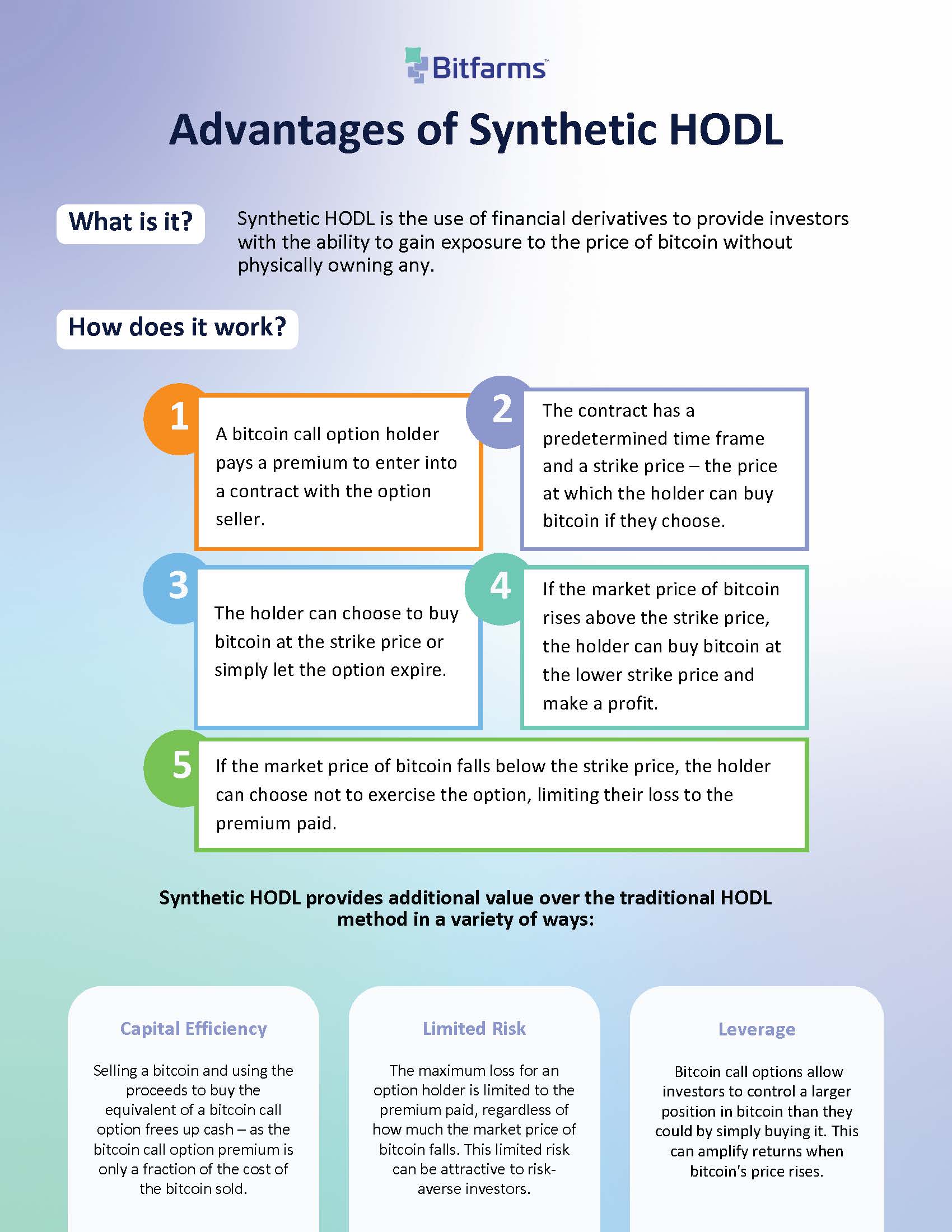 Synthetic HODL is the use of financial derivatives to provide investors with the ability to gain exposure to the price of bitcoin without physically owning the underlying asset. This method is known as "synthetic" because it mimics the performance of HODLing bitcoin, and they are called "bitcoin call options" because they provide the option to buy bitcoin at a predetermined price at a future date.